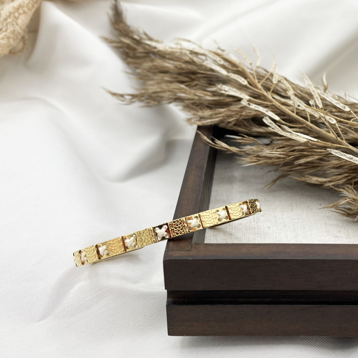 Fin bracelet alternant plusieurs textures ainsi qu'une broderie en croix d'un fil de coton écru.