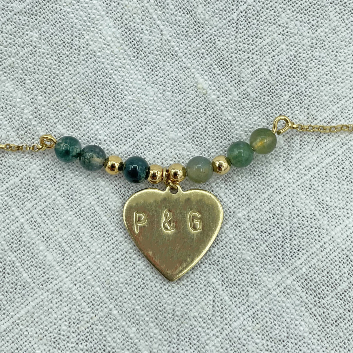 Fin et délicat, ce bracelet personnalisable vous rendra encore plus unique ! 100 % assemblé et estampé à la main dans notre atelier belge, les pièces ont été méticuleusement choisies pour allier originalité et qualité. (On parle de l'estampage; ou comment rendre des bijoux parfaitement imparfaits par ICI). Les pierres sont en agate mousse et séparées par des perles plaquées or, le bracelet est en gold filled et le cœur gravé, lui, est en ébauche de laiton. Un délai de 4 jours ouvrés est appliqué pour nous laisser le temps de peaufiner votre jolie commande !