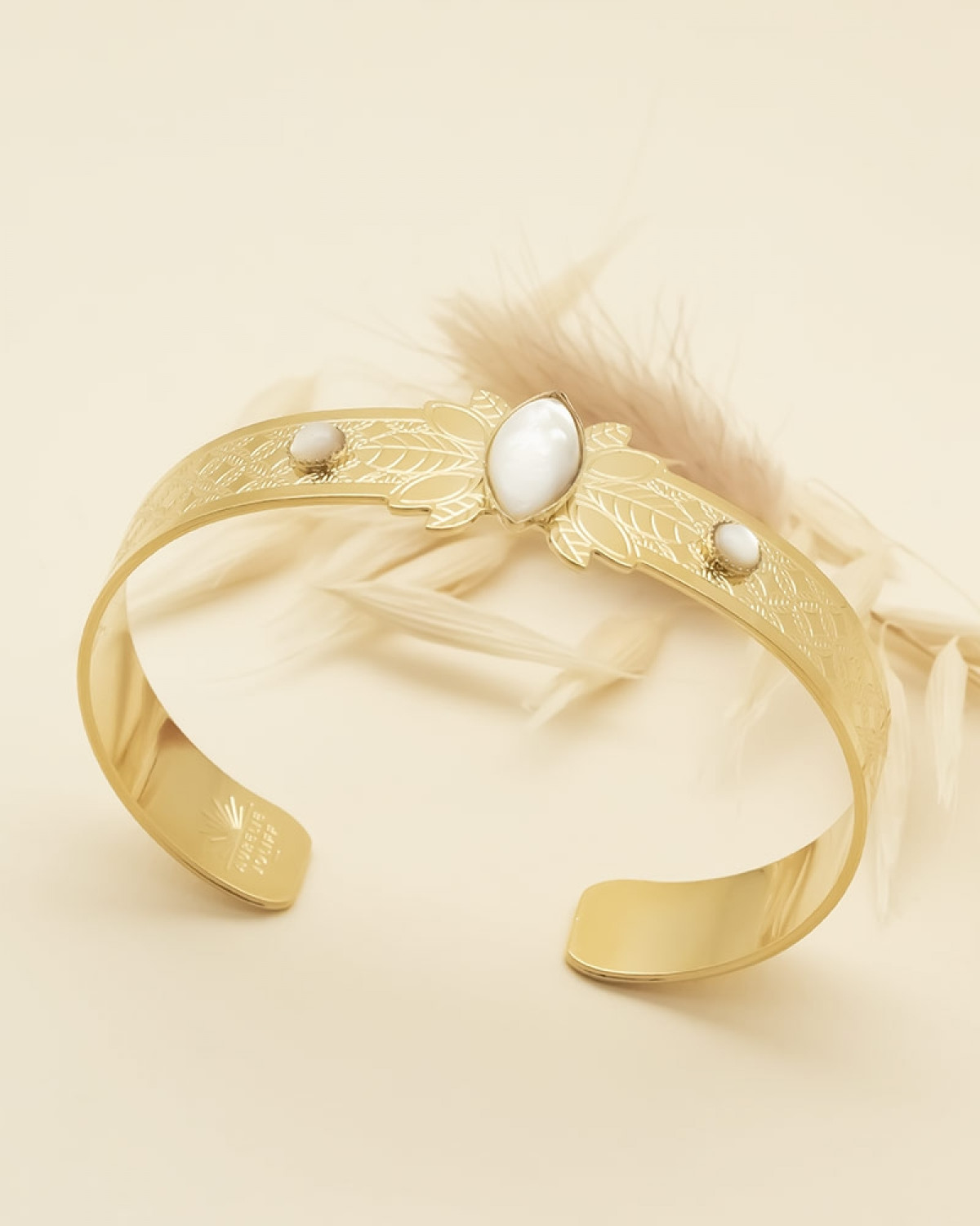 Inspiré de notre rêveuse préférée : Alice aux pays des Merveilles, ce jonc lui rend hommage. Représentant des feuilles, il est orné de deux petites naturelles en nacre ainsi qu’une plus grosse au centre pour rappeler la forêt enchantée.